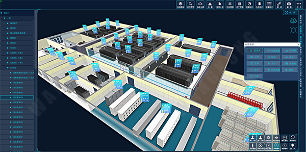 GNC-3D三维可视化监控管理系统软件为广州网控公司自主开发。GNC-3D 三维可视化监控管理软件以虚拟仿真的形式完整呈现监控中心结构、设备摆放情况和实时监控信息。通过鼠标的点击或触摸屏的手势操作,非常直观查看监控中心整体情况、设备的配置和状态及实时告警情况,为监控运维带来全仿真可视化环境,提高运维效率。3D可视化仿真软件能以鸟瞰、漫游、自动巡游等多种方式展示数据中心的基础设备情况,有力提升数据中心整体管理水平。
