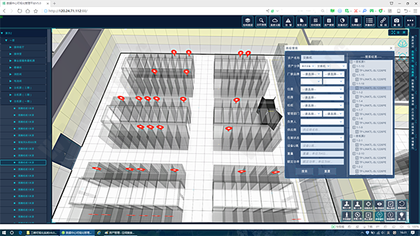用户可根据实际查找要求输入检索名称、检索位置以及可自定义添加检索条件,如资产名称、厂商品牌、供应商等实现可视化查找,并通过点击设备信息实现快速定位显示。