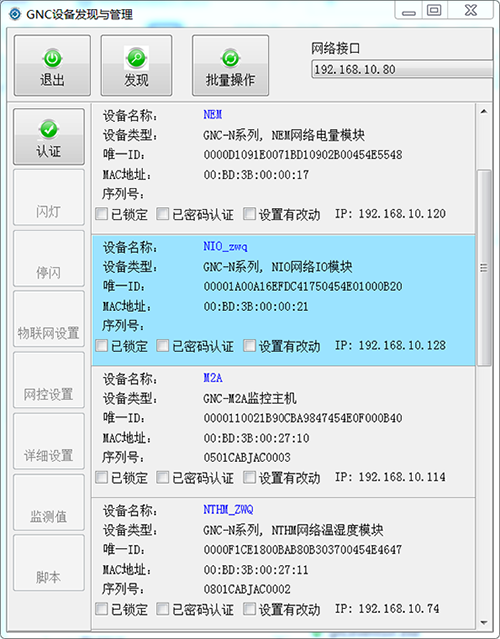 然后选中要测试的NIO,点击认证,缺省的密码是gnc,认证通过后就可以进行设置了,点击网控设置, 配置好IP地址或者使用DHCP,网控的中心地址那些可以不管,那是接入本公司SCADA软件用的。 然后点击物联网设置,读取后类似下面