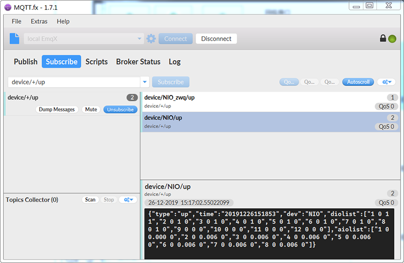 将MqttFx连接到与NIO同一个EmqX服务器,然后订阅话题device/+/up。