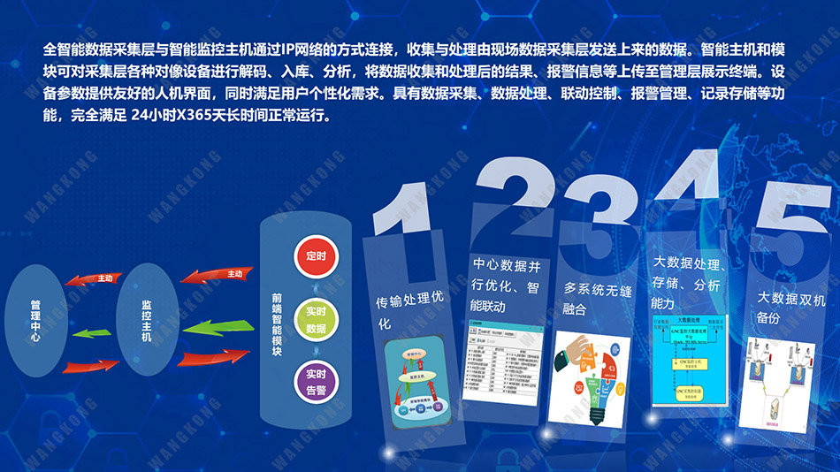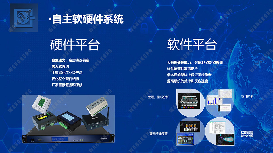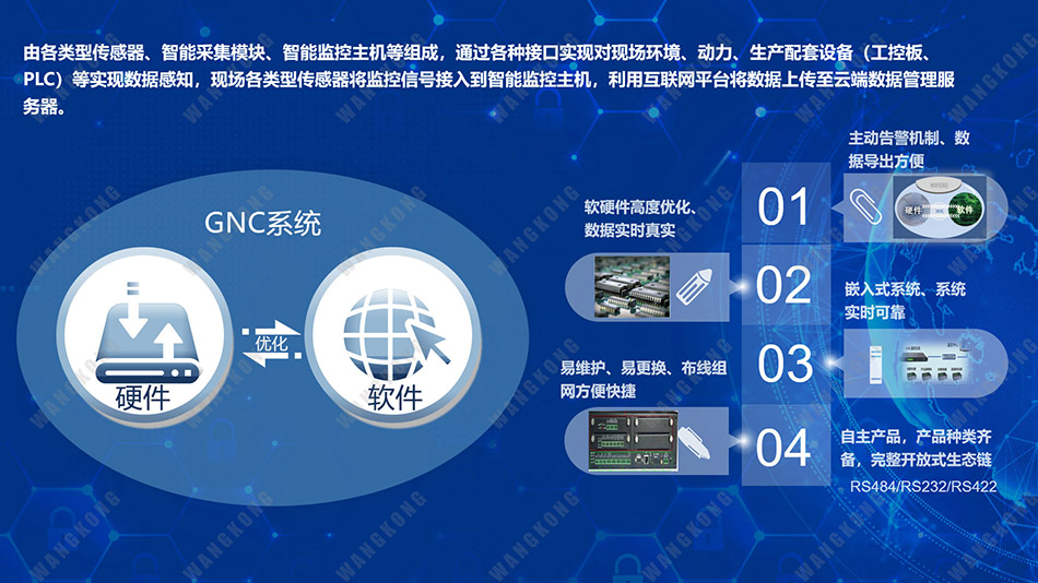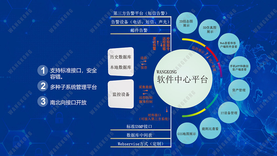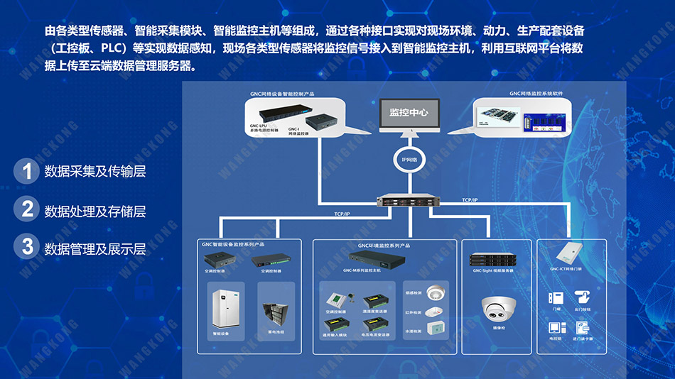 广州网控通信科技有限公司自主研发的WANGKONG智能监控系统采用完全分布式网络控制系统的新概念,以全新的构架去构建控制系统,能够满足SCADA系统,集控系统,完全分布控制系统的需要。本系统可广泛应用于各领域行业中的数据采集与监视控制系统,应用的领域与行业包括:通信领域(各行业通信机房和数据中心的动力环境监控系统)、电力行业(配电及辅助监测系统)、各行业集控系统(能源、环保、交通、水利、供热、供气等行业)以及智能楼宇监控系统。通过本系统的实施,实现对各类环境参数、各类设备运行状态参数实时动态监测,及时记录异常变动和自动报警,并可根据预先设计的联动策略,智能控制相关设备进行处理。通过本系统的实施,对生产、管理的自动化提供现场数据以及控制的技术手段,为物联网和工业互联网的实现提供信息化、智能化的保障。
