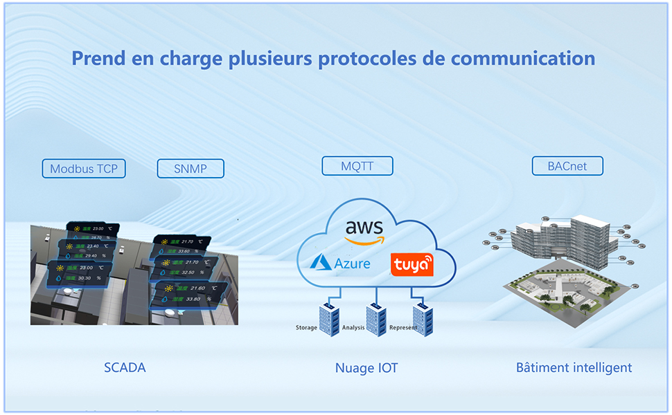 Compatibilité industrielle – prend en charge des protocoles tels que MQTT, BACnet, SNMP et Modbus TCP pour une intégration facile. Nous prenons en charge les protocoles ci-dessus et pouvons fournir des données de plusieurs façons simultanément.