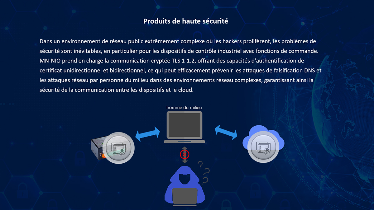 Dans un environnement de réseau public extrêmement complexe où les pirates sont omniprésents, les problèmes de sécurité sont inévitables, en particulier pour les dispositifs de contrôle industriel dotés de fonctions de commande. MN-NIO prend en charge la communication chiffrée TLS 1.1-1.2 et dispose de capacités d'authentification par certificat unidirectionnelle et bidirectionnelle, ce qui peut efficacement prévenir les fraudes DNS et les attaques réseau "homme du milieu" dans des environnements réseau complexes, assurant ainsi la sécurité de la communication entre les dispositifs et le cloud.
