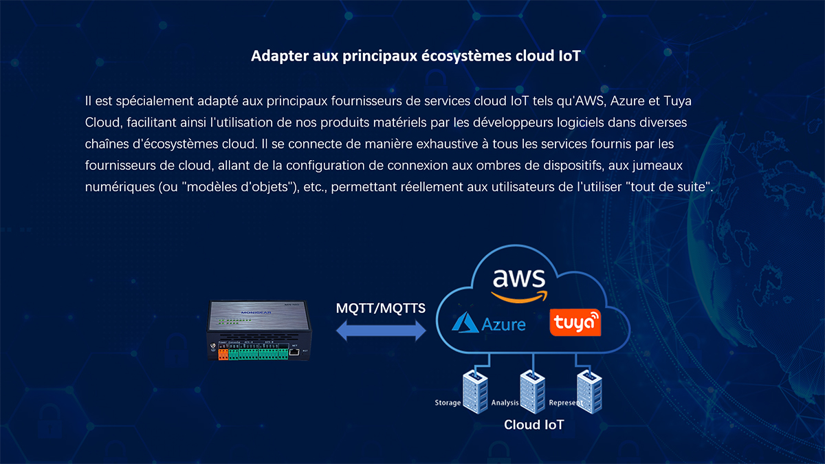 Spécialement adapté pour les principaux fournisseurs de services cloud IoT tels qu'AWS, Azure et Tuya Cloud, etc., afin de faciliter aux développeurs logiciels des écosystèmes cloud variés l'utilisation de nos produits matériels. De la configuration de connexion à l'intégration complète des services fournis par les fournisseurs de cloud tels que les ombres et les modèles d'objets, véritablement prêt à l'emploi.