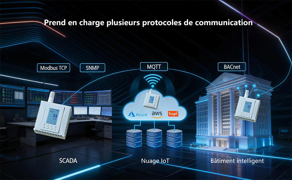 Compatibilité industrielle – prend en charge des protocoles tels que MQTT, BACnet, SNMP et Modbus TCP pour une intégration facile. Nous prenons en charge les protocoles ci-dessus et pouvons fournir des données de plusieurs façons simultanément.