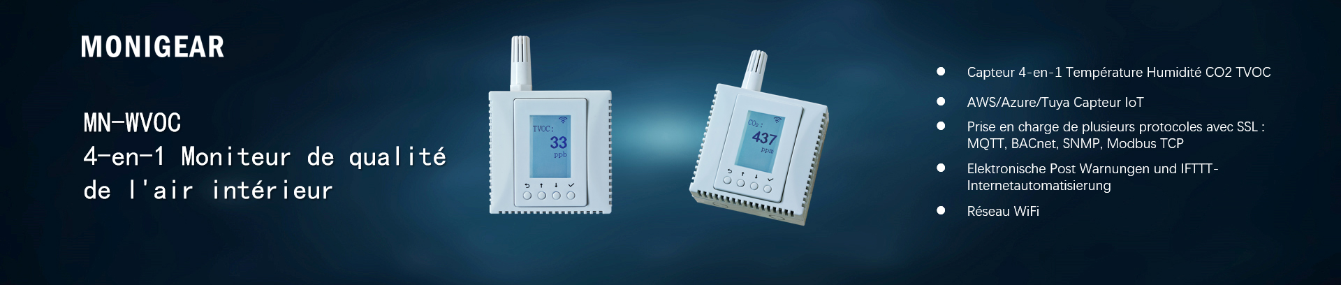 | Plage de mesure | Température: -30°C~85°C (-22°F~185°F); Humidité: 0-100% RH; Concentration en dioxyde de carbone: 400ppm–2000ppm; TVOC: 0-10,000 ppb |